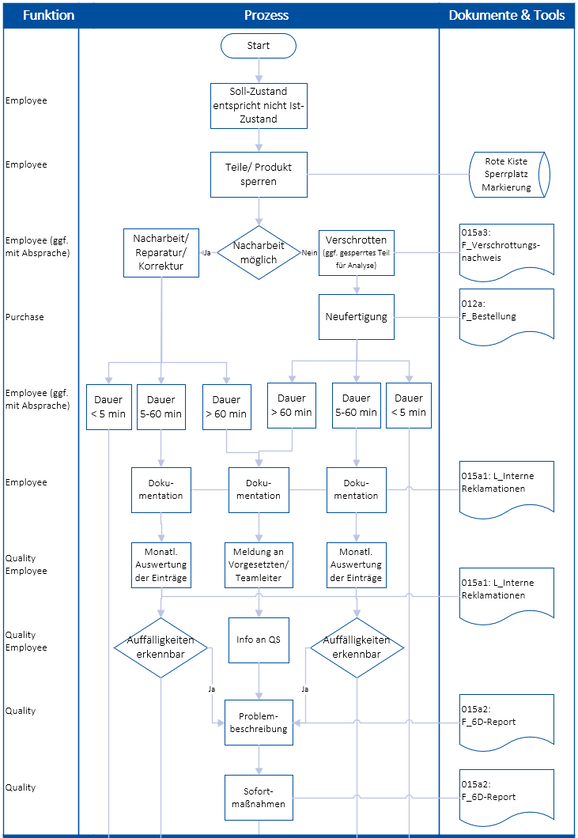 Dauert eine Nacharbeit oder eine Neufertigung weniger als 5 Minuten, kann ohne Meldung weitergearbeitet werden. Verschrottete Produkte müssen bei der Abteilung Purchase entsprechend ausgebucht werden.