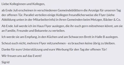 gern lade ich nochmal ein, die Flyer, die wir im Haus für den Tag der offenen Tür ausgelegt haben, mitzunehmen und an Freunde und Bekannte zu verteilen.